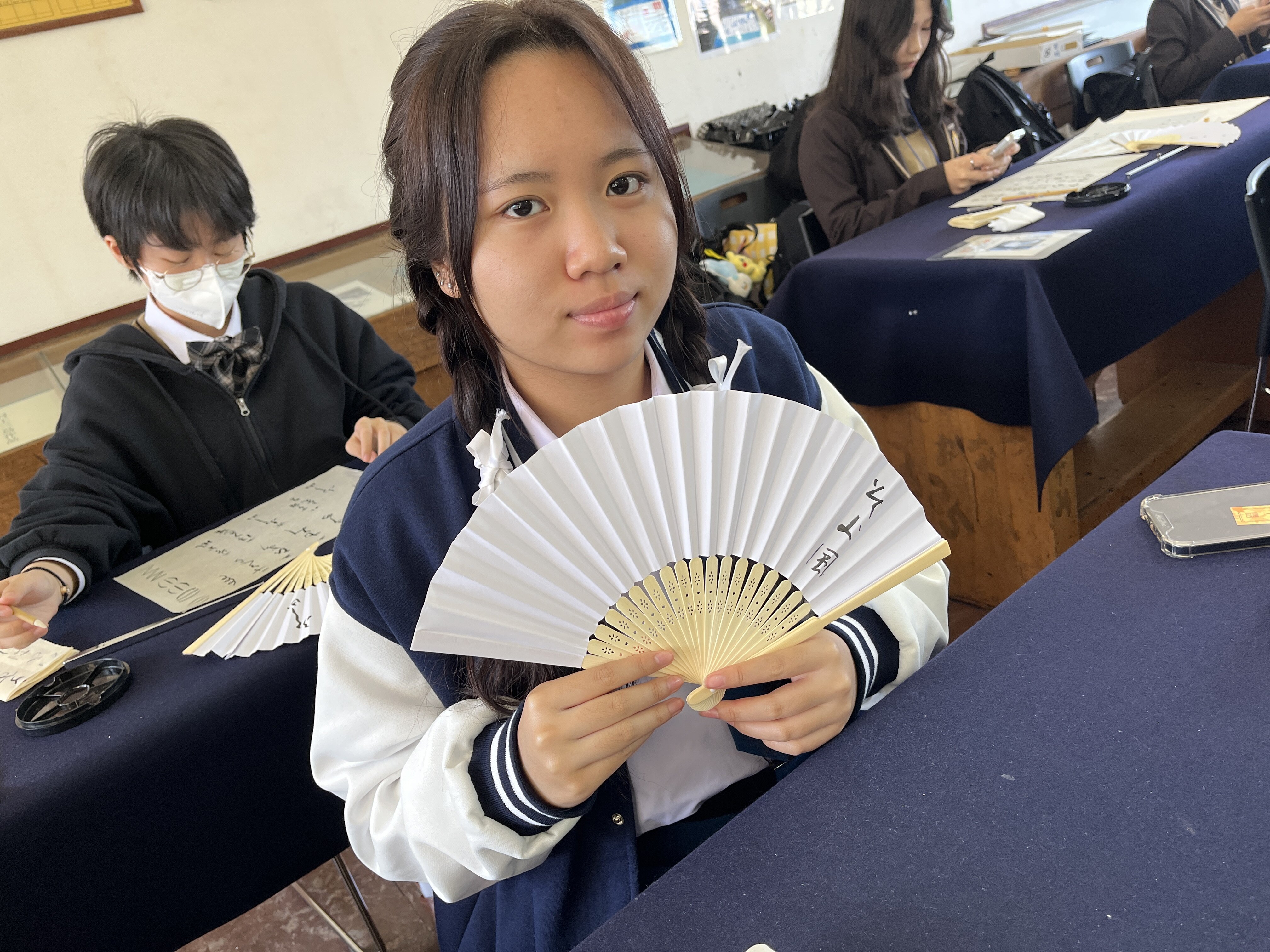 タイの留学生は初日から本校の授業に参加し、ホストシスターとともに、調理実習や書道、茶道などの日本文化を体験しました。調理実習では一緒にお好み焼きを作り、書道体験では筆の扱いに苦戦しながらも、日本語で思い思いの文字を書き上げるなど、笑顔あふれる時間になりました。